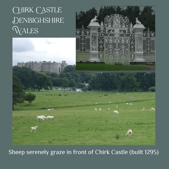 So it is not hard to reach Wales by car. In about an hour or so you can find yourself wending your way along narrow Welsh lanes hemmed in by the vibrant greens of trees and shrubs. So when you come to a pair of showy white gates (as seen in the image) the sight makes you stop. Further along you will find a field full of sheep with a castle in the background.