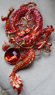 As well as having a few dragons around the house, I couldn't pass up a dragon to wear. Though I have a smaller dragon brooch than this, I thought I'd show the largest this week. It's from Butler and Wilson. Red, of course. Though also available in gold, the red called to me.