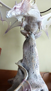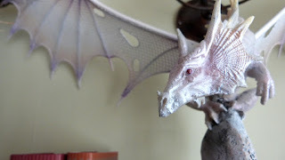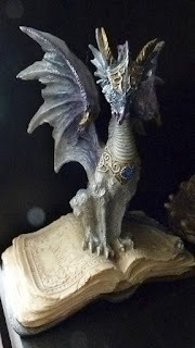I bought this dragon many years ago in part to support a book and trinket shop in Tintagel, Cornwall; what was King Arthur's Bookshop at the start of the path leading to the ruins. I often found interesting books in there, and I quite liked the shop. Sadly, it's now a pasty shop, though the bookshop stayed open for a good many years after I found this dragon, and at least it's not closed. On this occasion, there were no books I wanted, but not wishing to leave the shop without showing a local business some support, I opted for this chap. I mean, a dragon... sitting on a book. Had to be the logical choice.