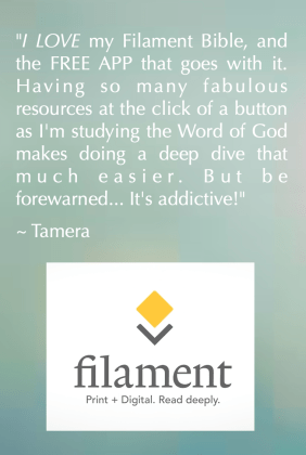 As the website describes, the Filament Bible combines the simple elegance of a premium Bible with the powerful capabilities of your mobile device. You get the best reading experience a print Bible can offer and instant access to more meaningful content than you’ll find in any one study Bible or devotional Bible.