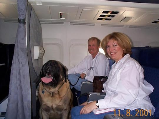 Now, you have to understand–this was only a few weeks after the terrorist attacks of 9/11. The airports were a mess, people were tense, and the security lines were long and disorganized. But when we walked up to security, all those tense faces melted into smiles. People surrounded Justus, petting him, and he was an instant star. Fortunately, his personality was –imagine that cartoon character who always said, “Uh, Gee, Tennessee–” know the one I mean? Laid back and a little dopey.