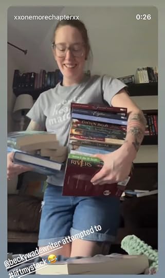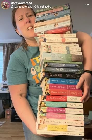 Here’s Joy at @dareyoutoread on Instagram, proving that her stack of Becky Wade books is substantially larger (and heavier to lift) than my own collection.