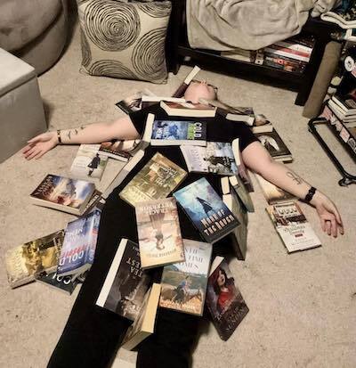 Here’s Paige at @xxonemorechapterxx on Instagram, as she attempts to lift two large stacks and several books go tumbling down.