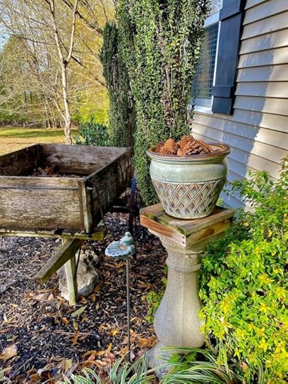 I’ve been trying to decorate a bit outdoors too, slowly replacing the plants in flower pots with pinecones and other wintery things, but we still have a geranium and begonias blooming their hearts out on the front porch, so I’ll wait until they succumb to a freeze before replacing them!