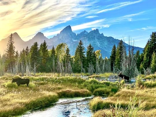 Today Ken and I are beginning Week 5 of a six-week loop through ten states, eight national parks, and many state parks. We have seen so many beautiful sights and have been reminded daily, hourly, that God’s glorious creation is very, very good! Do you see both of the moose in the photo above?