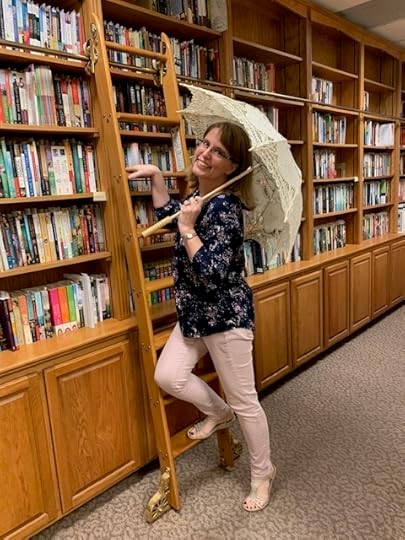 And it wasn’t just business. We were allowed to raid the book wall and help ourselves to free books as we as take some fun photos. I couldn’t resist the rolling library ladder and the prop parasol.