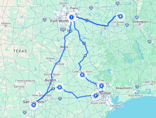I returned on Wednesday from the “Books & Boots Tour” of Texas that Dani Pettrey and I organized. Our road trip spanned more than 8 days and more than 1,000 miles. Texas is a huge state but, as you can see from the below route, we traveled a sizeable swath of it!