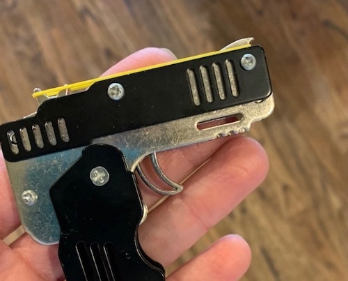 A gun toy that shoots rubber bands. I knew my friends were aware that Let It Be Me, the book coming out next month, is a milestone book for me. It’s my tenth Christian fiction novel. Clearly, this toy gun held significance. I wondered if it represented my book Her One and Only. In that one, the bodyguard heroine carried a handgun.
