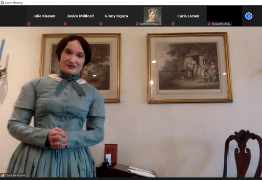 The performance was given over Zoom during a recent meeting of the MN chapter of the Jane Austen Society of North America. (And yes, I did find it rather ironic that Miss Brontë was addressing Janeites when she was not a fan of Miss Austen’s work. Thankfully, Laura herself is—in fact, I first met her at JASNA’s Annual General Meeting, and she also portrays Jane Austen and other historical figures as well.)