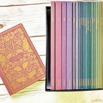 The Illuminated Scripture Journals have beautiful covers, and each cover represents something within the book itself. Inside, the book names and chapter numbers are gold, matching the gold on the covers. There are individual journals for every book of the Bible, with the exception of a few really short ones; those are combined (i.e. 1-3 John).