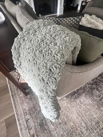 [image error]Favorite Color (and why): My current favorite color is a certain shade of green. It all started when I chose Sherwin-William’s Mountain Road paint as an exterior accent color on our house. I love the calmness of the shade. I’ve got it in the bedroom now, the chairs in the great room are that color. I’m drawn to it everywhere I go. My Aunt Jean even crocheted me an afghan that’s very close to that color.
