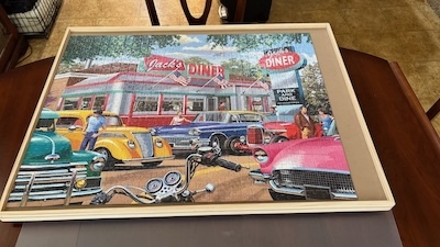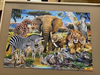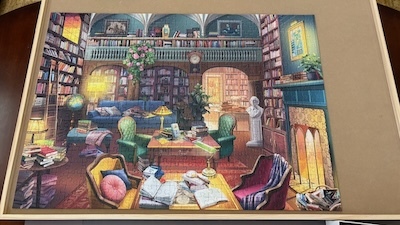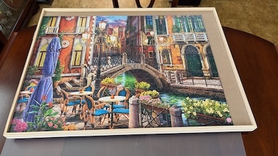 My favorite puzzles come from Ravensburger. I’ve tried others and been disappointed. I always get the Large Piece format, easier for older eyes and fingers. The largest size my puzzle board can handle is the 750 large piece puzzles, but that’s about the perfect size for me. Takes me long enough to complete without it being so long I get frustrated.