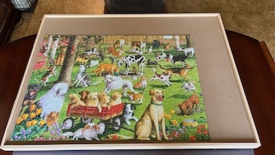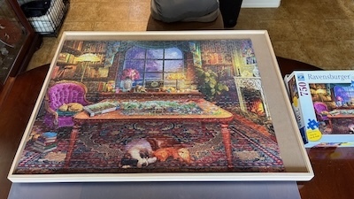I treated myself to a puzzle board a couple of Christmases ago, when Princess Pinky was still with me. There is nothing like a cat to cause a person to lose puzzle pieces! The board I got swivels 360 degrees and has four drawers and a cover to protect it when the human is away and a cat is at large. Pinky crossed the rainbow bridge last October (I still miss her), so the cover doesn’t get used now. But the board continues to see lots of action.