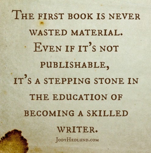 The first book is never wasted material. Even if it’s not publishable, it’s a stepping stone in the education of becoming a skilled writer. Most published authors have a file with early manuscripts that never saw the light of day. But those books were important (essential) in developing writing skills.