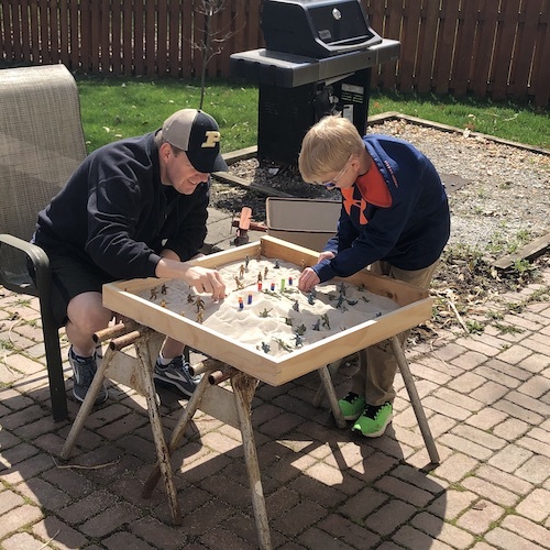 My husband also had the brilliant idea to build this sandbox with our nine-year-old and then got out his army men and sets he’d been saving for the boys. A friend sent a bunch of tiny flamingos that were added to the mix, some with painted on camoflauge. Hours spent outside setting up all sorts of battles.