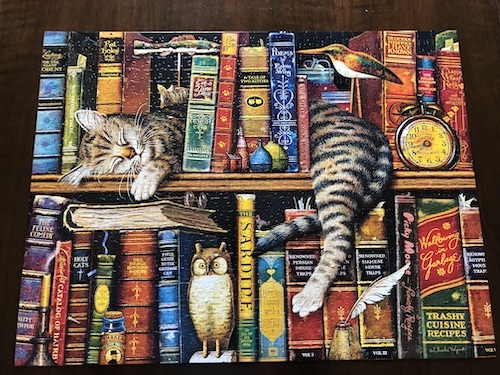 Anyone else tackle puzzles over quarantine? This is the latest of the ten or so I’ve tackled. I love that this one has cats and books, but I’ve done everything from a NYC watercolor street to a French village to a fair. One of my other favorites involved all different kinds of coffee…that one inspired a series of instagram live videos on how to make different types of Starbucks inspired drinks at home. You can find those here for your viewing pleasure.