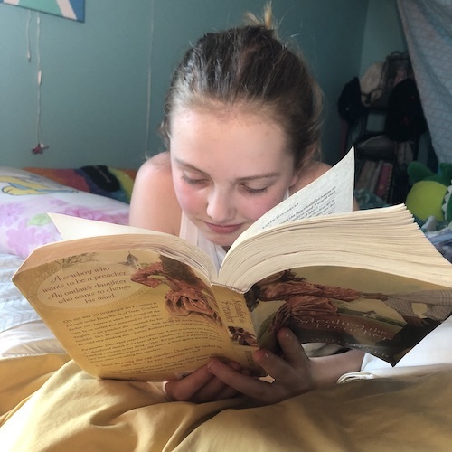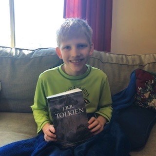 I don’t think I needed to worry. Here’s our nine-year-old tackeling the Lord of the Rings trilogy. He read the first two books in April, and then has taken a pause for some “lighter” reading this month. He moved on to Louis Lamour!