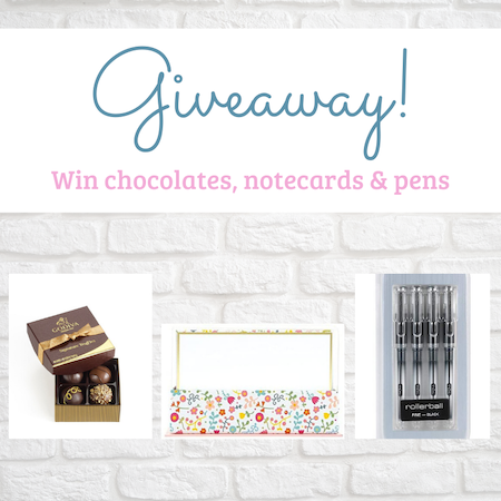 To celebrate Stay with Me’s release, I’ve created a giveaway that includes a few of my favorite things — chocolate, a set of my favorite notecards, and a set of my favorite pens. This giveaway is open to residents of the USA and I’ll randomly select a winner when the giveaway closes. Enter via the entry box below!