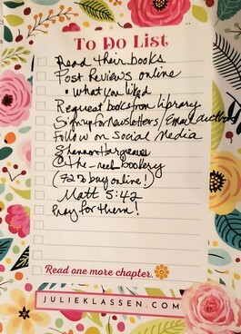 Read their booksPost reviews online Request their books from the librarySign up for their newslettersEmail authors (with encouragement or suggestions)Follow them on social mediaPray for themIf you’re a reader who has done any, some, or all of these things, THANK YOU! If you are an author, what might you add to this list?