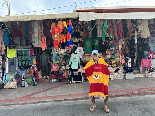 After a tiny bit of shopping, my brother-in-law scored a serape branded with his favorite team. He’ll be dressed in one-of-a-kind merch for their next football-watching party.