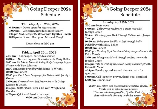 I can’t wait! In one month, the inaugural Going Deeper Conference begins. This writers conference is the brain-child of author-friend Erica Vetsch, and will be held in her hometown of Rochester, Minnesota April 25-27.