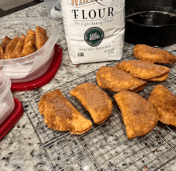 Fried apple pies are such a pleasure to make. I enjoy making them about as much as eating them. Working with the dough, cooking the apples until they’re almost caramelized… And really, I counted this as research for the current book I’m writing. Because someone in the book is making them and I’m currently writing that scene. Research is hard work. : )