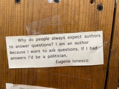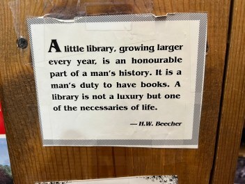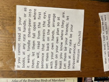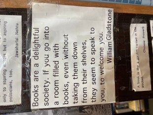 On the edges of bookshelves, on any free wall space, they have quotes. Quotes about books. Quotes about reading. Quotes pertaining to the subject of books on said shelf!