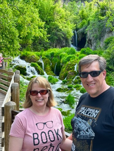 Despite the admonition from a famous pop song to “don’t go chasin’ waterfalls,” that is precisely what I did when my husband and I traveled to Deadwood, SD last month. We were making the trip so I and several author friends could participate in a book event called Wild Deadwood Reads. Wes and I turned the trip into a mini vacation as well, touring as many sights as possible along the way. We both enjoy hiking and discovering natural wonders, so when we learned that there was a scenic byway just north of Deadwood, we knew we wanted to make time to explore.