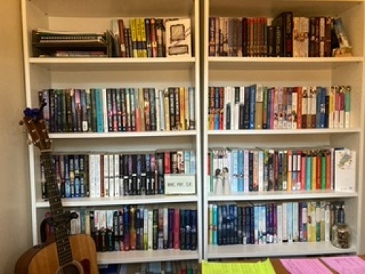 To my surprise and delight, there was a “Jesus is Lord” sticker on the door. And the very first book shelves inside were filled with Christian fiction! Four shelves of Christian fiction, followed by several shelves of Christian non-fiction. Wonderful!