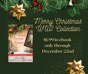 But before that, I just learned that Where Treetops Glisten is on ebook sale until December 22. This is your chance to grab this WWII novella collection I wrote with my friends Tricia Goyer and Sarah Sundin. We had so much fun creating this collection that tells the story of each sibling at Christmas in a different year during WWII.