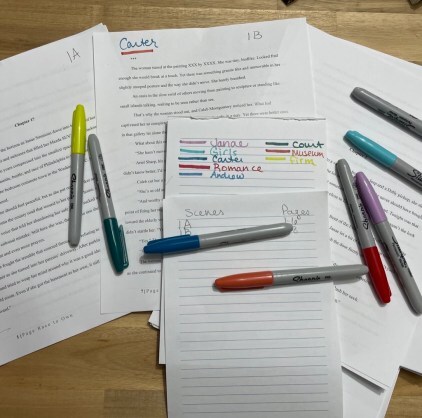 That means I printed off a copy of the document, broken apart by scene, so I could see what I actually have. That’s 200 pages of writing, with two and a half pages of notes scrawled on sheets of paper. I then color coded at the top who the point-of-view character is in the scene and other key details. The goal is that a glance will tell me what’s there so I can see what needs to be added. Maybe it just made me feel productive when I was fighting the fatigue of my end of semester crash — that came two weeks too early. However, this process has helped me see what I have and what is missing. Namely for this book the suspense is going to have to be heavily layered in as I rearrange the pages and scenes. Fortunately, my brainstorming group helped me find some key questions that should aid in identifying ways I can get a few bodies and mayhew laced into the words. Wish me luck!