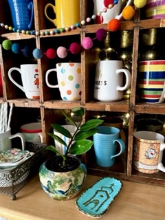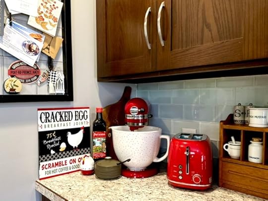 Pic 1: Look at that adorable Coca Cola cookie jar! Pic 2: The lovely round blue and white “scroll” jar on the left (that perfectly coordinates with the other jars she has). Pic 3: That adorable “Cracked Egg” sign that she tucked with her cute little chicken timer. And finally, pic 4: I brought her a little teal “church” spoon rest that she’s using in her coffee center.