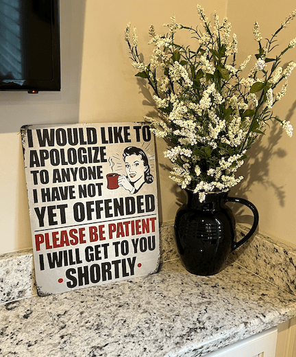 I love bowls! Especially vintage white mixing bowls, so those two thrifty treasures came home with me. As did that cute little pitcher (and another bigger one not pictured). And I couldn’t resist the sign, which, if that offends you, well . . . ; )