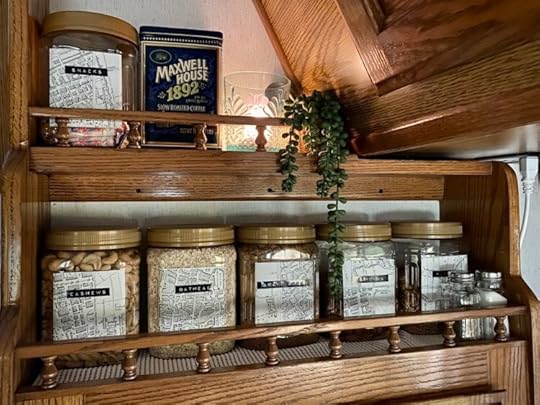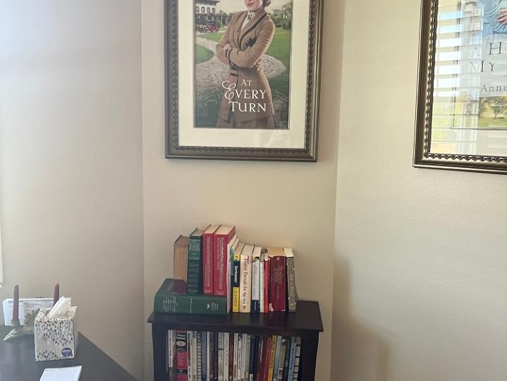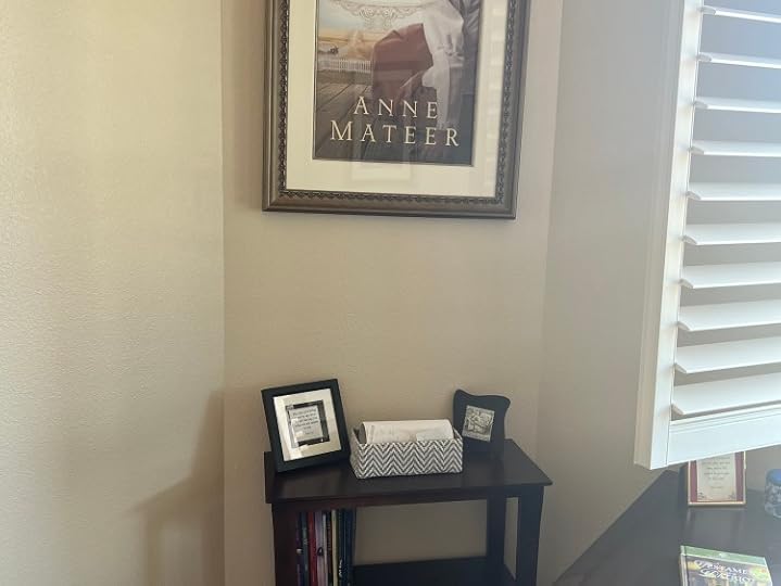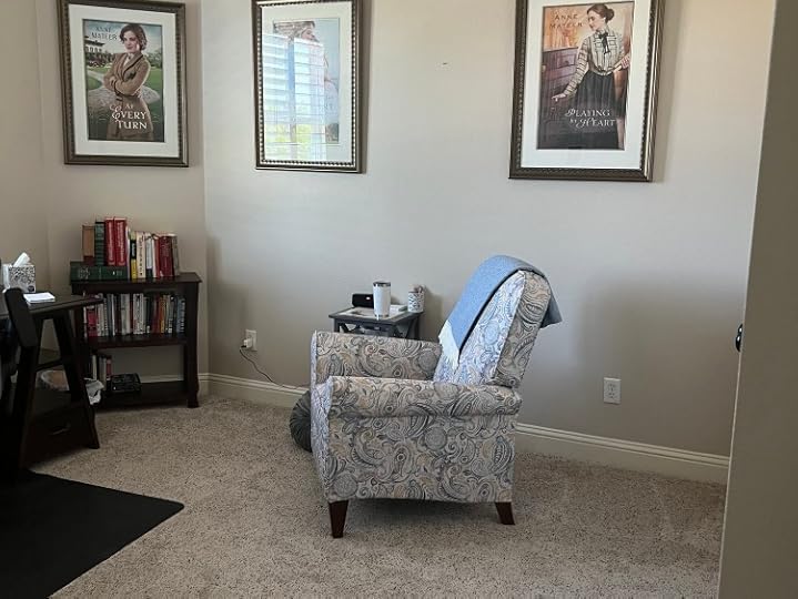 I’m happy to again have a place for the lovely prints of my Bethany House book covers that my sweet husband had framed for me with each new release. I also added the Elizabeth Wade Little Women map my son and daughter-in-law gave me and hope to get another of her book map paintings for the opposite side of that wall. In between, a lovely calendar I found last year. Each month shows a different work of art which features a woman reading. How perfect is that!