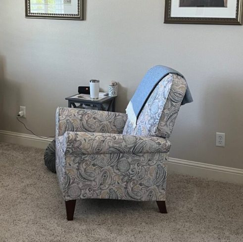 When I was in the process of moving to this space, my husband offered to buy me a chair for my birthday. I found this lovely recliner at Lazy-boy and I couldn’t be happier! It’s comfortable and cute all at the same time. To top it off, I finally found a cozy throw to compliment it and to keep me warm on winter days.