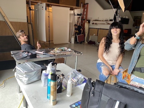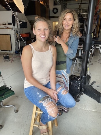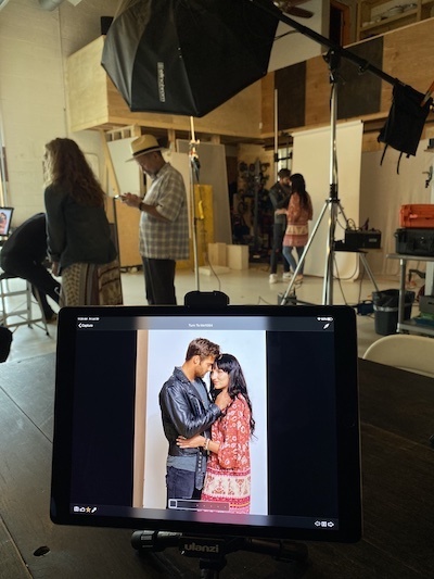 I love this shot! The monitor shows how the team is able to check the photos as they’re coming in to determine if they’re achieving the look they want. You can see Paul Higdon, Creative Director (in the hat), in the background. Beyond that, Bryant and Ellie are standing in front of a white backdrop.