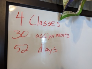 I have 52 days until I have to be done with all of these classes. 30 assignments to complete for these 4 classes in order to be done with them. And they’re all kinda hefty classes. Considering I typically only do school work on weekdays, I actually only have about 38 days left. Which means I have to complete approximately .57 assignments per day for the next two months. I’ve been averaging about 2 assignments per day for the past month, but those assignments were a bit easier. These are all pretty time consuming efforts.
