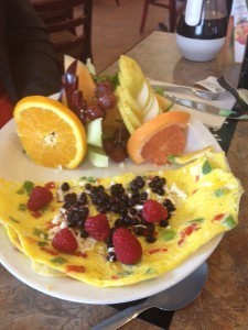 By the time we reached Sudbury I was cold, wet and hungry. My pants had developed a little portal in a seam and cold Canadian rain was rolling down into my waterproof boots. Dismounting the bike, I sloshed into the Tutti Fruitti restroom (called a “washroom” in Canada) to wring everything out. When I whipped out my camera to take a picture of the beautiful meal you see here, my not-yet-month-old-camera was unresponsive. Fortunately Jill had her phone and snapped one for me. I hadn’t bothered carrying my phone because the international rates are exorbitant and, after all, I bought a CAMERA for pictures.