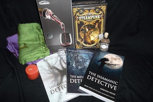 Riga Hayworth medley, which includes: * A wine aerator; * Steampunk Tarot, by Barbara Moore; * Deviant Moon Graveyard Dirt; * Two prosperity scarves - one purple, one green; * The Metaphysical Detective; * The Alchemical Detective; * The Shamanic Detective; and * An orange tea candle. Contest is open from October 31 - November 18 18+ US/ CAN residents. Fill out the form below to enter