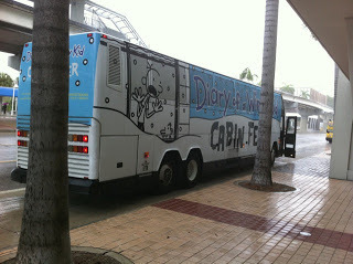 Here is the tour bus for Diary of a Wimpy Kid. It was parked up while Jeff Kinney and Miami Book Fair was being rained on. The driver told me that this bus tours just the east coast.