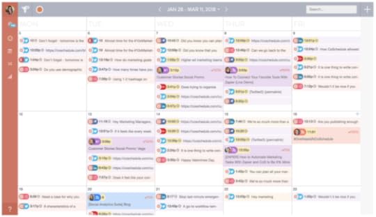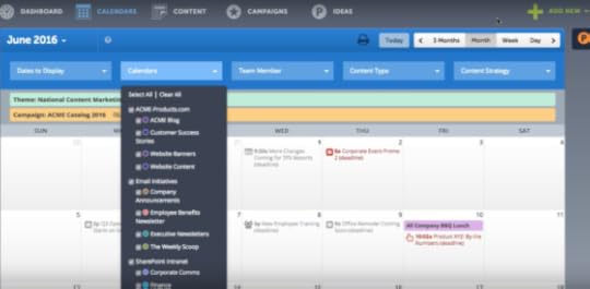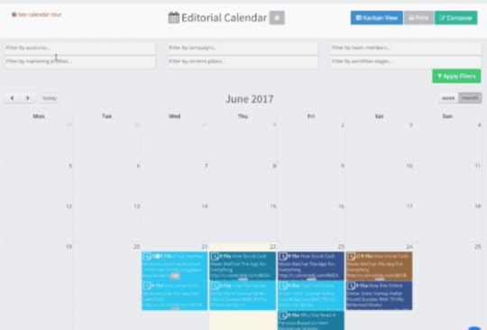 The primary objective of this tool is to organize all the important ingredients of content marketing into a single system. This avoids the need to bounce around from platform to platform (or dashboard to dashboard) for everything you need. Designed with social media in mind, users can easily integrate their Facebook account, LinkedIn, Twitter, etc. all into a unified posting agenda. You can also color code the grid to differentiate the channels.