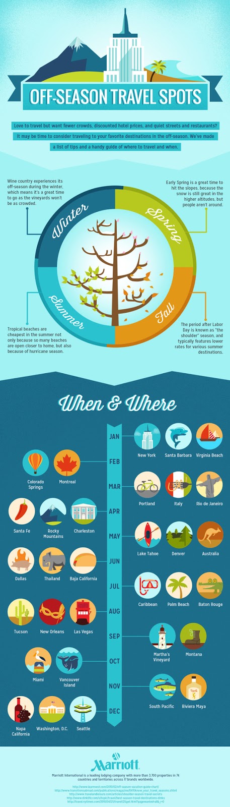 We almost always travel in the off-season, because we can. It saves us a ton of money and allows us to be more relaxed, because our destination is never packed with other tourists and children. Go when a destination is less desirable and you, too, could save big bucks over visiting during when it's most busy. This awesome infographic from Marriott and Lifehacker shows you when and where to travel for the best deals and lowest crowds.