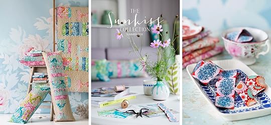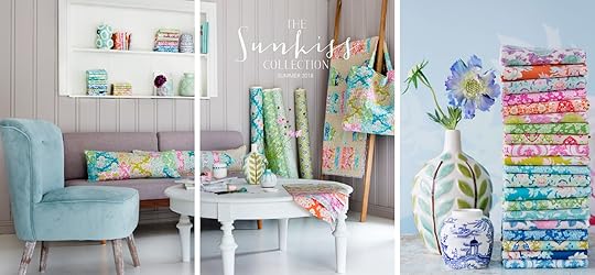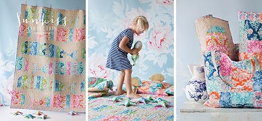 The Sunkiss Collection is inspired by bright turquoise water, beautiful fowers, colorful corals and anemones waving with the current as you break through the water’s surface. The rich and warm colors are a perfect contrast to sun-kissed summer skin and the muted palette of beach life, with its whitewashed wood, stone and sand. We hope the Sunkiss Collection will inspire you to sew vibrant, colorful pillows and quilts, beach bags and fun summer clothes for the kids.