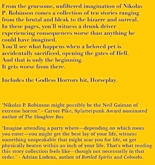 Not only does this collection include the sleeper hit, Horseplay, from Godless, but it contains nine additional short stories that are sure to make my readers uncomfortable as often as it entertains them. Not only that, but I have made certain to include a brief note that details the inspiration behind each of these tales of terror and tribulation. Some of these notes are more worthwhile than others, but I wanted you–my readers–to know me a little better when you came out of the experience than you might have on your way in.