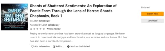 This is the second collection of assorted poetry from John Baltisberger I’ve had the pleasure of experiencing. This time, it was in audiobook format rather than chapbook, as In Service of Slaughter had been.
