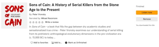 Fair warning, as the end of the book approaches, and Vronsky is discussing the “Golden Age of Serial Killers” here in America, spanning from the mid-1960s through the 1990s, there are some rather long lists involved. They can become more than a little tedious but are essential to capturing a full understanding of what he’s trying to convey. That was the one section of this book where I’d have preferred to be reading rather than listening to the narration.