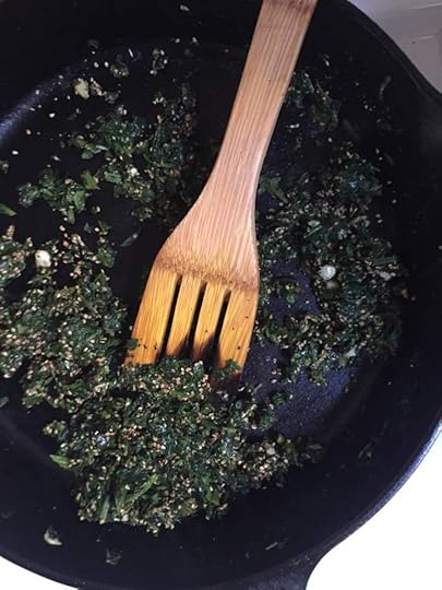 I made some garlicky spinach with sesame seeds as one of the components. You could also use raw kale salad, pickled Asian pear, or just about any vegetable lingering in your produce bin.