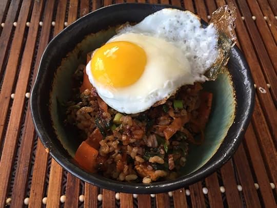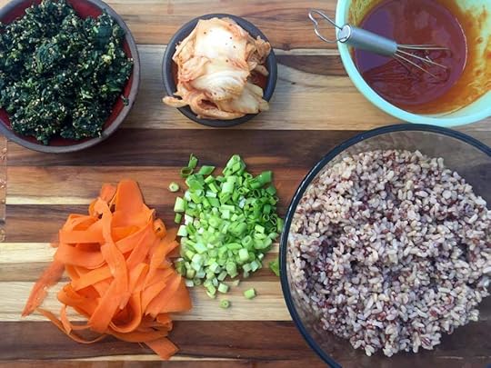 I topped my bibimbap with a variety of vegetables, kimchi, and a couple of eggs. You'll want to gather everything up and have it completely preppred before serving.
