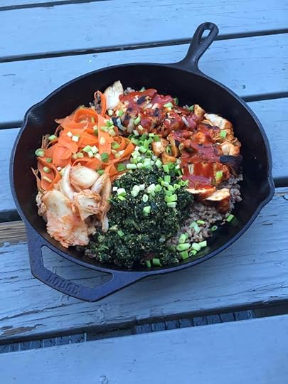 I've alway loved Bibimbap, a Korean dish of rice, meat, and vegetables, typically served in a stone pot, which serves to keep it hot and also to crisp the rice. I had never made it at home before, because I assumed I needed an actual stone pot. But a few weeks ago, as I was garnishing a panful of crispy roasted chicken legs, it occurred to me that my cast iron frying pan could probably produce the same results. I am so happy to tell you that was right.
