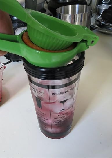 Next, we need to get out our cocktail shaker and fill it with 2 teaspoons of the syrup, plus blood orange juice (you can use any kind of orange juice you like -- have fun with the symbolism), and vodka.